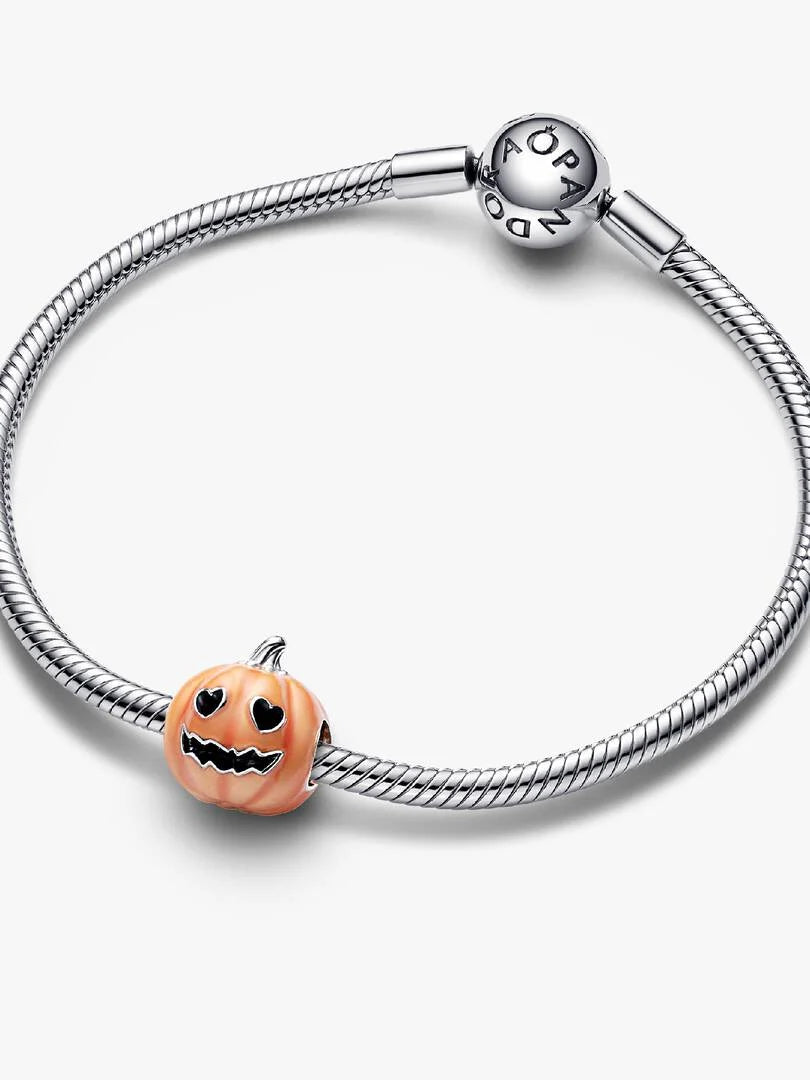 This delightful Glow-in-the-dark Spooky Pumpkin Charm in sterling silver is the perfect Halloween friend. Intricately detailed with a spooky face and heart-shaped eyes, this enamel-painted charm turns dark green when the