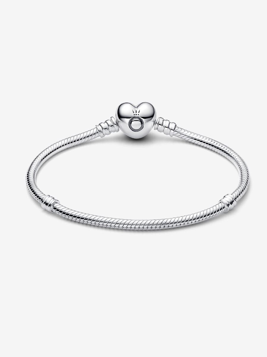 A romantic version of Pandora's bestselling bracelet. Hand-finished with a heart-shaped clasp, this sterling silver snake chain bracelet makes a sleek statement on its own – or adorned with your favourite ch...
