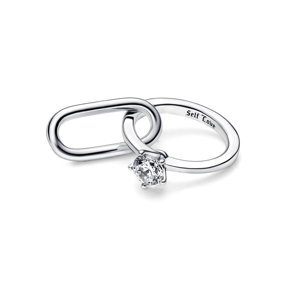 Special features: polished rounded rectangular link; the other link is shaped as a solitaire ring; five prongs holding the stone in the centerpiece; engraved message inside the ring shank.